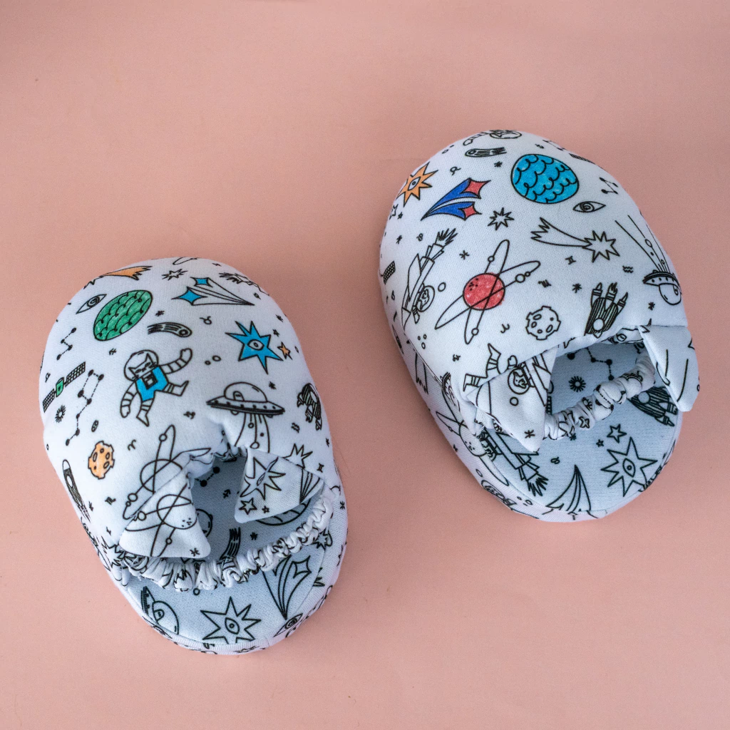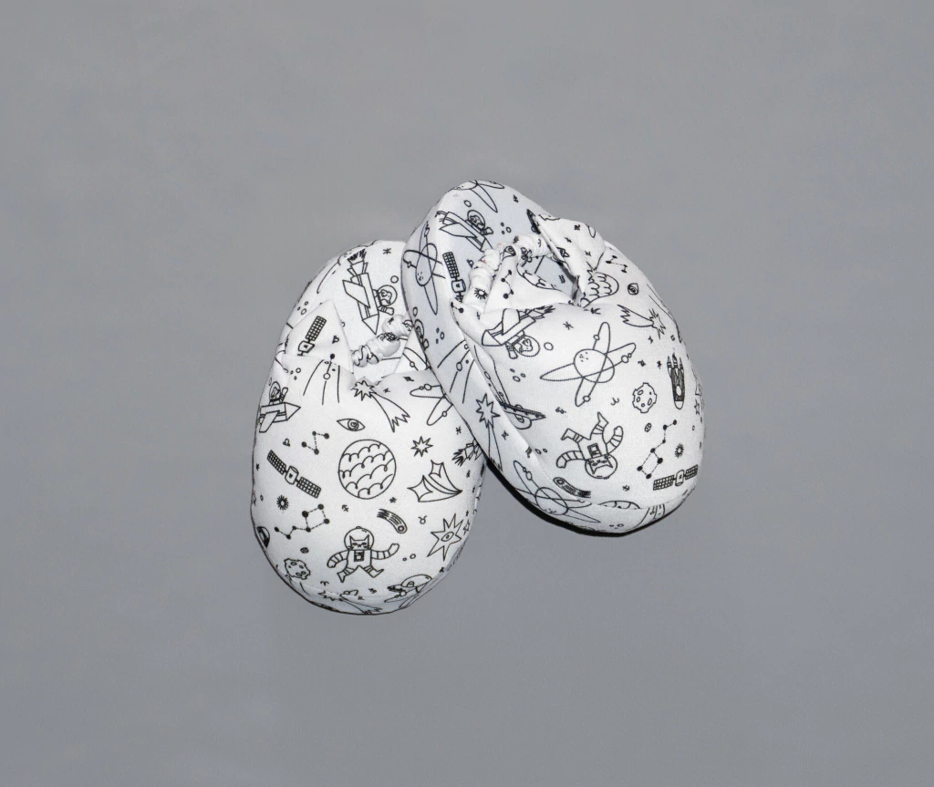 Pantuflas para pintar confeccionadas en jersey de algodón, de textura fresca y liviana. Suela antideslizante, súper suaves! Tienen orejitas y elástico para que no se escapen. Fabricadas artesanalmente. La estampa de Cosmos en blanco y negro, hecha con pigmentos amigables con el ambiente, está inspirada en el trabajo y amor de Tigrecitos sin hogar.💛🐾